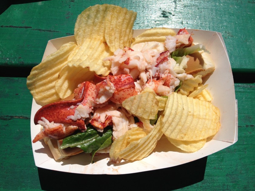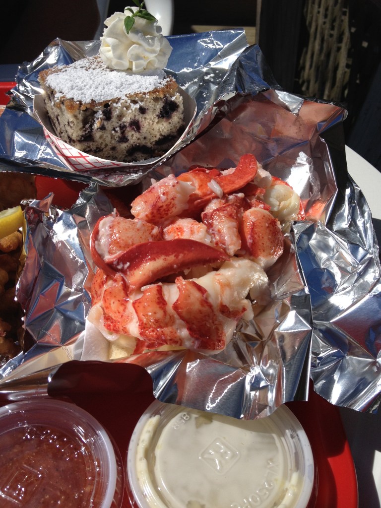 Et puis, il en valait la peine, ce sandwich, qui contient au minimum, selon les dires, toute la chair d’un homard d’une livre (le prix du marché le fixait à 15$ lors de notre passage)? Je dois avouer que oui. Il débordait de homard et je l’ai savouré jusqu’à la dernière bouchée. Chéri, quant à lui, a été un peu déçu de ses palourdes frites, qui avaient trop de fried et pas assez de clams à son goût. Le petit gâteau fait maison aux bleuets sauvages de la région terminait en beauté le repas, mais nous avons aussi traîné notre gourmandise jusqu’à la porte d’à côté, chez Lears Old Fashioned Ice Cream, pour goûter à la crème glacée au homard (douce, subtile, mais définitivement moins attirante si vous venez déjà de manger l’équivalent d’un homard en entier pour le repas) et partager un bon cornet à la saveur creamsicle.