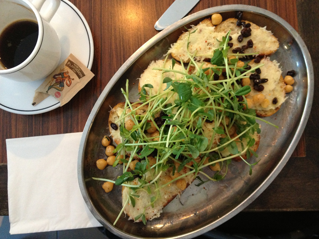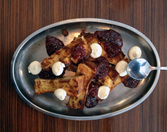 Comme chez son grand frère, le restaurant Le St-Urbain, la nourriture servie chez La Bête à Pain impressionne plus que son décor. Lors de notre passage, nous avons pu déguster un pain perdu rôti avec confiture de framboise et mascarpone (seulement un tiers de tranche par personne, on en aurait voulu plus!); des croûtons de pain au levain toasté surmontés de brandade de morue, des œufs pochés avec crème de parmesan (la sauce au parmesan était délectable, j’en aurais mangé davantage mais on ne comptait qu’un œuf par convive), une salade de chou frisé accompagnée de speck, des boulettes de viande aux champignons, des pommes de terres frites ainsi que des beignets moelleux aux pommes, à la cannelle et au calvados.