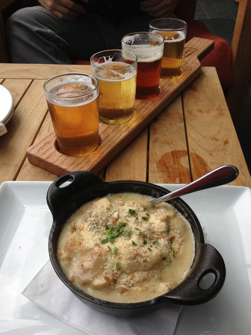 À notre sortie de chez Soma, il pleut à torrents, alors on se réfugie par nécessité au Mill Street Brewpub en espérant qu’ils ne feront pas trop de cas du fait que nous sommes accompagnés d’un enfant – dans une microbrasserie. À notre grande surprise, on nous accueille chaleureusement et on nous offre de s’asseoir avec le reste de la clientèle, sous la terrasse couverte, pendant l’averse. Je ne pourrai résister à leur potato and ricotta dumplings dans une sauce fromagée aux champignons avec une bonne stout (bière noire), alors que chéri optera, quant à lui, pour le plateau de dégustation de quatre bières de la microbrasserie. Nous découvrirons même, plus tard, que non seulement la Mill Street Brewery est accueillante envers les familles, mais que la partie intérieure du brewpub propose un menu pour enfants, quelque chose de quasi impensable, ici, au Québec. Nous n’avons pas pu en profiter cette fois-ci, puisque fiston dormait, mais nous y retournerons assurément.