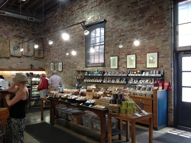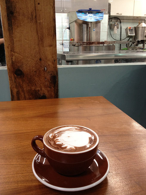 Pour distraire fiston – qui aime déjà beaucoup la ballade – on arrête prendre une bouchée à la Brick Street Bakery, on entre dans la magnifique boutique pour enfants Mini Mioche (où il fera ses tous premiers traits de craie dans la petite aire de jeux pour enfants, au son des «oh!» et «wow!» de ses parents définitivement surexcités) et on le laisse aussi s’amuser dans le coin des jeux chez Bergo Designs. Fort de toutes ces découvertes (et aussi parce qu’il fait chaud et humide en cette belle journée de juin), il s’endort à notre arrivée chez Soma Chocolate, où papa et maman en profitent pour se reposer un peu et déguster un spicy mayan hot chocolate. Bon, je l’avoue, c’est surtout maman qui est aux anges parce que, hormis le magnifique décor de la fabrique qui laisse à découvert les briques rouges antiques du Distillery District, les produits de cette chocolaterie sont absolument décadents.