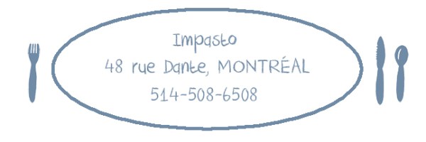 Ouvert depuis juillet dernier, juste en diagonale de la quincaillerie Dante, le restaurant Impasto ne pouvait tout simplement pas passer inaperçu avec l’ancien chef du restaurant Osteria Venti et l’animateur (Al Dente sur CASA et In the kitchen sur CBC) et auteur de trois livres de recettes à ses commandes. Heureusement pour eux et pour nous, ce qu’on y sert répond largement aux attentes. D’une part, il y a cet accueil chaleureux, souriant et sincère et, d’autre part, un menu alléchant de cuisine italienne à la fois réconfortante et exécutée avec des ingrédients de qualité. Je ne suis pas une personne qui accorde habituellement beaucoup d’attention au service reçu dans un restaurant (je regarde toujours, en premier, ce qui est servi dans mon assiette), mais je dois avouer qu’un restaurant branché, où il faut réserver des semaines à l’avance et où la présence d’enfants se fait plutôt rare, qui nous accueille aussi chaleureusement avec nos bambins, je trouve cela particulièrement rafraîchissant.