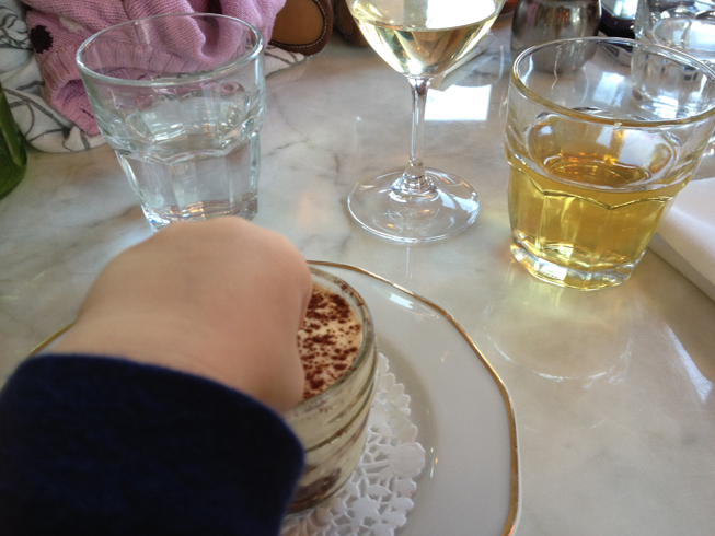 Bien sûr, nous y avons mangé un repas digne de mention: en entrée, une soupe de kale, tomate et haricots blancs (rien d’extraordinaire, mais tout ce dont on avait besoin en ce beau vendredi de novembre) et une salade de betteraves et fregola. Comme plats principaux, nous avons opté pour les pâtes: cavatelli dans une sauce aux tomates, à la saucisse et au safran et capellini aux champignons (certainement dans les meilleurs que j’aie mangés dans ma vie et, croyez-moi, j’en mange à la tonne, des pâtes aux champignons). Et pour dessert, un excellent tiramisu (pour ça aussi, je suis hyper difficile) même si fiston m’en a volé toute la crème…