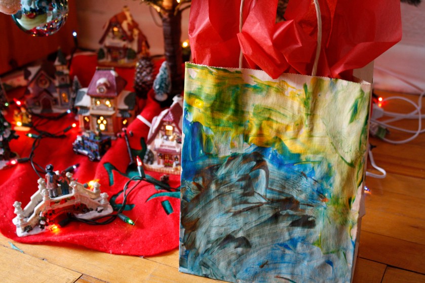 Il est aussi très amusant de demander aux enfants de faire le portrait de la personne à qui on offrira le cadeau. Vous pouvez les faire dessiner directement sur le cadeau emballé, mais comme on ne sait jamais vraiment ce que cela peut donner, je vous suggère plutôt de les laisser s’amuser sur des papiers que vous pourrez ensuite découper et coller sur des sacs ou sur un autre emballage. Devinez lequel est le mien?