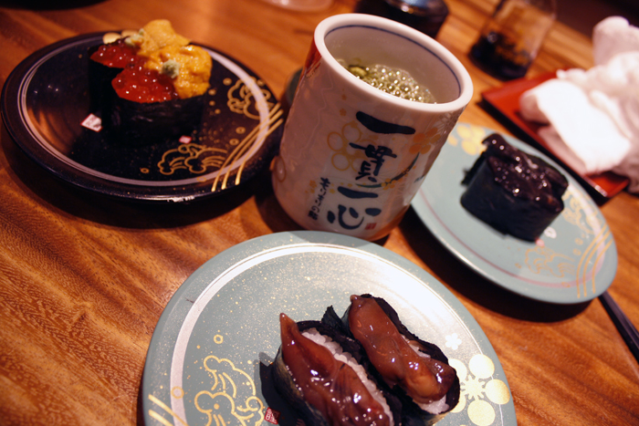 Pour le prix, cela varie énormément d’une place à l’autre. Les petites assiettes sur lesquelles sont servis les sushis sont de différentes couleurs et chacune d’elles correspond à un prix, habituellement bien indiqué et qui se situe entre un et cinq dollars environ. Nous avons dû, très souvent, être assis sur un petit tabouret – pas très pratique avec un enfant – mais plusieurs établissements nous ont offert une chaise haute. Ils nous ont aussi donné des ustensiles – ce qui, au Japon, est une denrée rare. J’en traînais toujours avec moi pour ma fille. Si le chef parle quelques mots d’anglais, ce qui n’est pas toujours le cas, nous commandions toujours un bol de riz pour notre fille, ce qui nous facilitait la tâche. Pour les adultes, le restaurant fournit le thé matcha à volonté que nous devons préparer nous-mêmes à l’aide du robinet d’eau chaude qui se trouve à notre place.