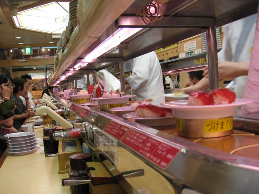 Ces génies ont inventé un concept de restaurant fort intéressant : le kaiten-zushi. Dans ce type de restaurant, tout le monde s’assoit autour d’un bar de forme plus ou moins ovale qui encercle les chefs. Ces derniers nous préparent de magnifiques sushis qu’ils déposent sur de petites assiettes. La magie du concept, c’est que ces assiettes sont mises sur un petit tapis roulant qui tourne devant nos yeux. Ainsi, nous pouvons les regarder passer, saisir celle qui nous interpelle le plus ou attendre quelques minutes afin de mettre la main sur ce que les chefs préparent.