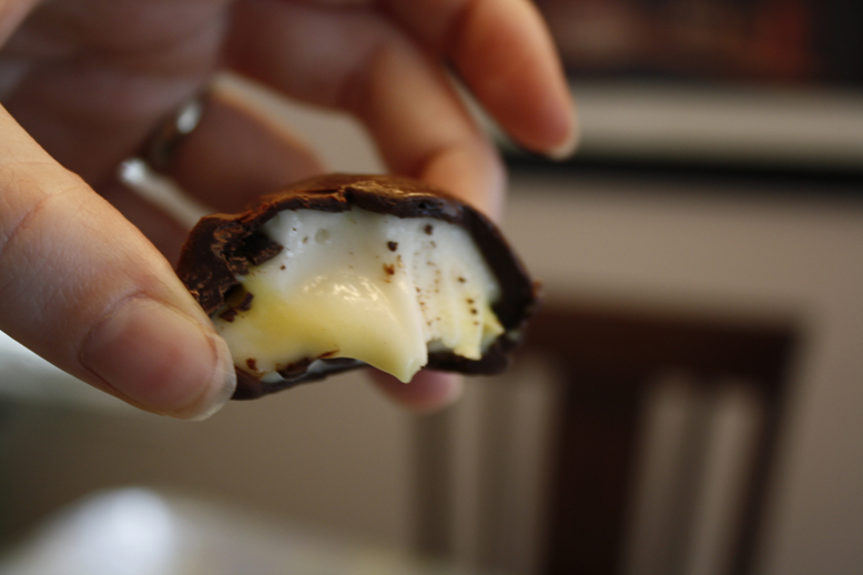 J’ai suivi cette recette (en anglais), qui a été créée dans l’intention de faire du fudge. Je trouvais qu’il était beaucoup plus intéressant de confectionner des œufs, alors j’ai congelé la pâte en trois parties (deux blanches et une jaune). Lorsque le tout se tenait bien, ma fille et moi avons roulé une partie de la pâte jaune entre deux parties de pâte blanche, afin de former un œuf, puis répété l’opération dans le but d’utiliser toute la pâte. Nous avons ensuite remis tous les œufs créés dans le congélateur. Lorsque gelés, nous les avons trempé dans le chocolat fondu à l’aide d’une cuillère, et les avons remis de nouveau dans le congélateur pour les faire figer. Lorsque les œufs se tiennent bien, on peut les laisser sur le comptoir quelques minutes avant de les déguster… succès assuré chez les petits et les grands! S’il en reste quelques-uns, laissez-les au congélateur. Vous pourrez les conserver quelques jours.