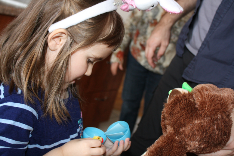 Comme elle n’a que quatre ans, nous avons dû lui lire les indices, cachés dans plusieurs œufs dispersés dans la maison. Ces derniers sont très simples, il va sans dire, et lui permettent de trouver le prochain œuf. Ils ressemblaient à : « Cherche l’œuf où l’on met les aliments pour les garder au froid » ou « Regarde sur le sofa de grand-papa ». Bref, rien de trop complexe, mais il faut cacher de nombreux œufs, car la chasse peut être très courte sinon.