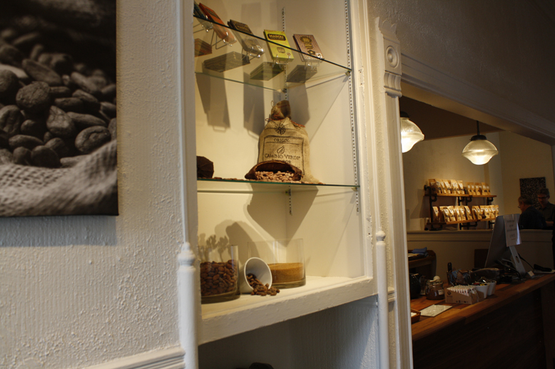 Il y a aussi un petit coin bistrot où vous pourrez déguster un chocolat chaud pur de la compagnie Marou, accompagné d’un morceau de chocolat de la même origine afin de comparer les deux. Vous allez adorer! Peut-être un peu trop intense pour vos petits, les employés peuvent « allonger » le chocolat avec du lait pour eux. Plaisir assuré! N’oubliez pas aussi de goûter à une de leurs infusions de grué, qui est l’éclat de la fève de cacao, que la boutique peut vous servir. Personnellement, je n’avais jamais goûté à quelque chose du genre, mais j’ai été renversée du goût complexe, mais non sucré, de ce breuvage. D’ailleurs, si vous aimez, vous pourrez aussi rapporter du grué à la maison ainsi que certaines pastilles de chocolat en vrac.
