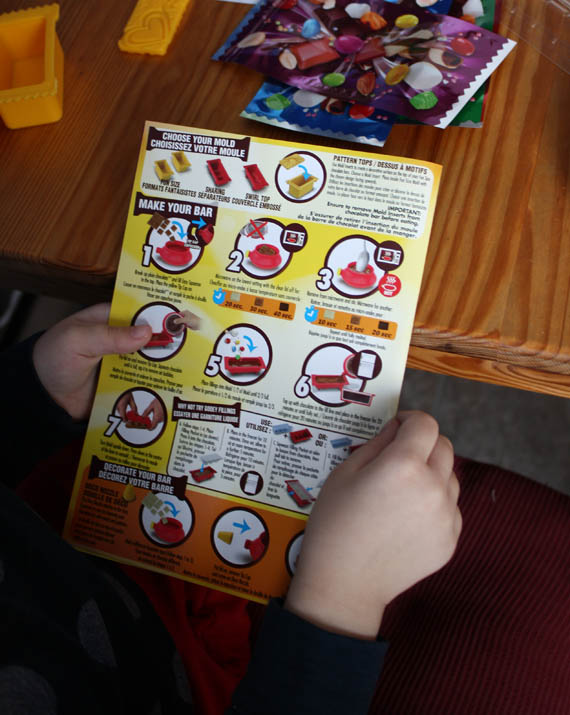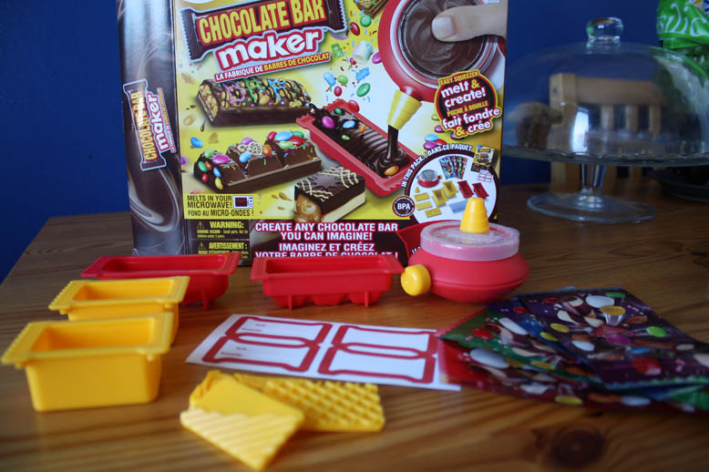L’ensemble, disponible dans plusieurs magasins au Québec (notamment chez Toys’R’Us et Archambault) depuis quelques semaines, pour environ 20$, contient le matériel nécessaire à la confection de barres maison. Il comprend tous les moules et accessoires pour créer de belles barres de chocolat, mais aucun aliment. Ainsi, ce sera à vous d’acheter le chocolat et les friandises que vous désirez y intégrer.