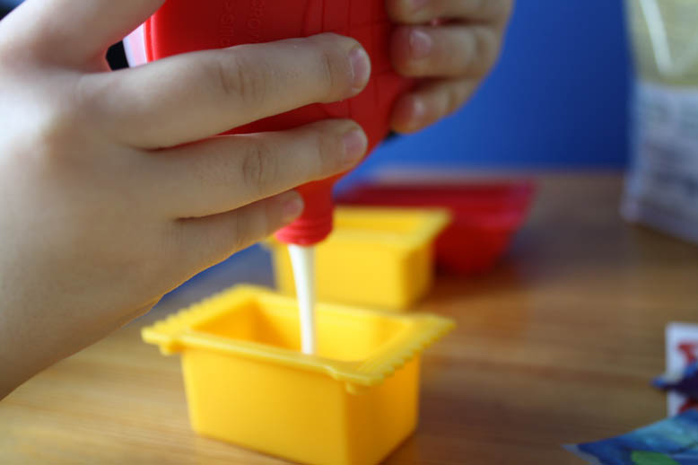Vous devrez d’abord faire fondre le chocolat dans la douille prévue pour les enfants. On vous suggère de la mettre directement au micro-ondes (les temps à suivre sont bien indiqués dans le livret d’instruction, selon le type de chocolat utilisé), mais vous pourriez tout aussi bien faire fondre le chocolat au bain-marie et le transférer par la suite. La douille est parfaite pour les petites mains et vos enfants pourront aisément déposer le chocolat dans les moules.