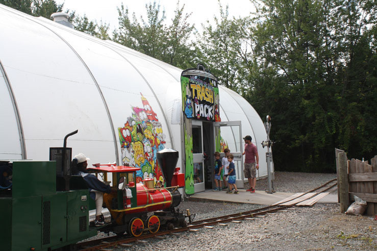 Ne manquez surtout pas la zone Trash Pack, qui est située dans un dôme, et où les enfants peuvent s’amuser pendant des heures dans les tunnels, boules et glissades. Ma fille a adoré… Petit détail intéressant : les organisateurs ont installé de nombreuses chaises Adirondak pour les parents qui peuvent se reposer pendant que les enfants s’amusent. Prenez note que les enfants doivent obligatoirement porter des bas dans cette zone, alors prévoyez le coup! De plus, comme dans tous les manèges, vous devrez mesurer vos enfants pour savoir s’ils sont de la bonne grandeur. Les très jeunes (1 ou 2 ans) pourraient parfois être déçus, mais le parc a été pensé pour accommoder le plus d’enfants possible. Dans cette zone, vous trouverez aussi de nombreux endroits pour vous asseoir, manger ou vous reposer. Vous y croiserez aussi probablement quelques mascottes Shopkins, Trash Pack ou Zelfs entre deux manèges. Profitez-en pour faire un petit tour de train, de carrousel ou pour jouer à des jeux d’adresse. Attendez-vous à y passer quelques heures…