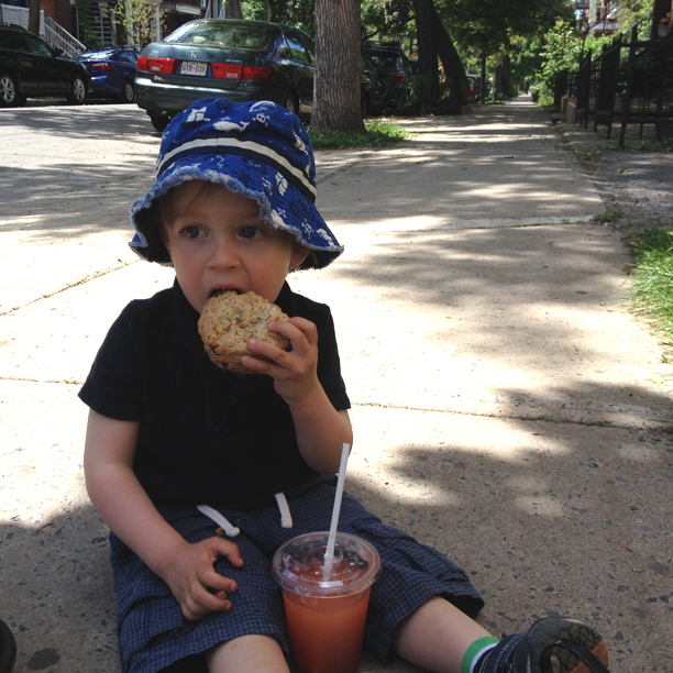 Incapable de patienter, fiston s’obstine pour manger son scone et sa barbotine à la fraise & fruit de la passion directement sur le trottoir…