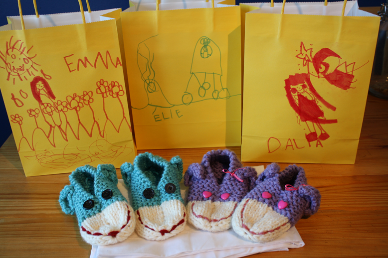 Toujours selon le thème, les enfants, à leur arrivée, recevaient un sac surprise, décoré par notre fille, dans lequel nous leur avons tous fait cadeau d’une paire de pantoufles en forme de singe tricotées par moi-même (c’est un peu de la folie, je l’avoue). Ils y trouvaient aussi une taie d’oreiller qu’ils devaient, au courant de la journée, décorer avec des crayons à tissu. Ainsi, chaque enfant pouvait repartir avec son oeuvre d’art. De plus, une taie d’oreiller spéciale pour la fêtée était mise à leur disposition et chaque enfant pouvait y mettre un petit mot ou un dessin. Notre fille dort maintenant toujours avec cette dernière et se remémore les amis présents à cette journée magique.