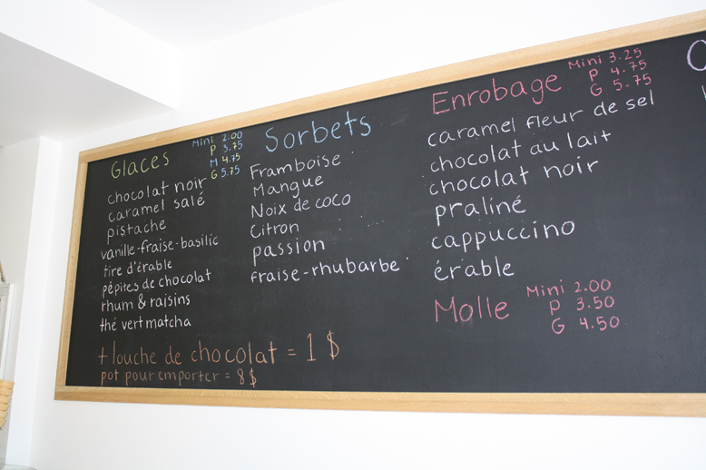 Mais, ce qui nous fait revenir sans cesse ici, c’est plutôt les crèmes glacées molles, aussi faites maison, qui sont trempées dans des enrobages chocolatés décadents. Cette fois, on vous suggère le praliné ou le caramel et fleur de sel, délicatement préparés ici même. Absolument génial! Tout récemment, la propriétaire a fait l’acquisition d’une machine à yogourt glacé qui vous permettra de déguster la saveur du moment. Présentement, goûtez au tourbillon de vanille et mangue… Décadent! On nous a soufflé à l’oreille que les fraises du Québec devraient voler la vedette sous peu.