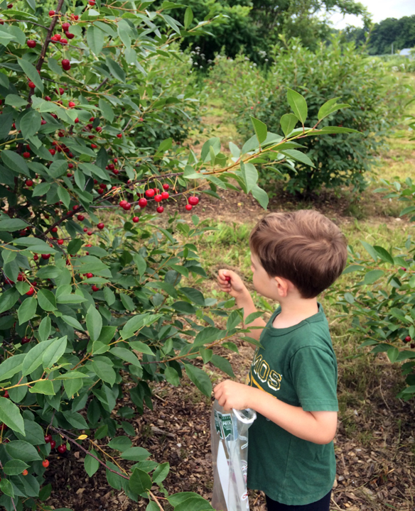 J’ai toujours adoré l’autocueillette, mais depuis que je suis maman, j’en fais encore plus souvent qu’avant! La raison? C’est une activité idéale pour les tout petits, dès leur plus jeune âge, qui nous donne, de surcroît, un prétexte pour cuisiner en famille dès notre retour la maison, avec le fruit de nos récoltes. En ce début de juillet, nous avions déjà épuisé nos réserves de fraises, alors nous avons décidé d’aller cueillir quelque chose de différent: des cerises.
