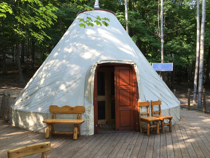 Notre journée ne s’arrêtait pas là! Le Parc Oméga offre, depuis peu, de magnifiques hébergements qui vous permettent de prolonger votre séjour. Vous pourrez choisir entre des tipis et des cabanes en bois ronds ou même sur pilotis. De notre côté, nous avons opté pour la Wi-tente, à mi-chemin entre un tipi et une cabane. En fait, la tente est de forme conique et vous trouverez, à l’intérieur, trois lits (dont un double), une table en bois sculptée et quatre chaises, une cruche d’eau et un four à bois. Il y a aussi quelques panneaux solaires qui permettent de nous éclairer avec des lampes fournies dans la tente. Sur la galerie qui l’entoure, vous aurez aussi accès à une toilette écologique uniquement pour vous… Et tout cela en face d’un bel étang!