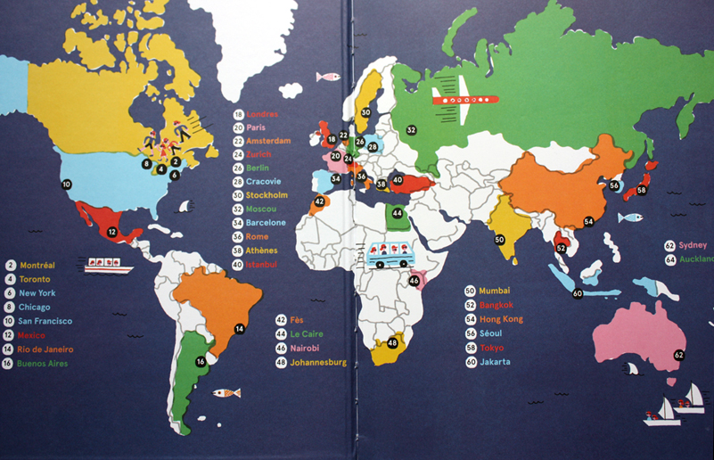 C’est la rentrée, mais chez nous, les vacances s’éternisent. Depuis quelques semaines déjà, à l’heure du coucher, nous voyageons grâce aux dessins ludiques et uniques de Benoit Tardif. Mon garçon de quatre ans n’a pas encore pris l’avion, mais il prend plaisir à choisir un numéro sur la carte du monde, puis nous révéler s’il aimerait, un jour, aller dans telle ou telle ville, tel ou tel pays. J’ai l’impression que tranquillement, tout un monde s’ouvre à lui.
