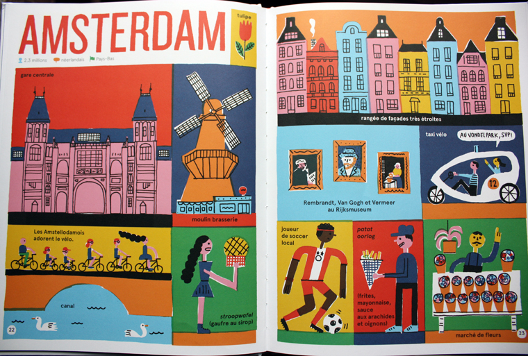 Pour chacune des trente-deux villes présentées, l’auteur et illustrateur a choisi de représenter certains de ses monuments importants, des spécialités culinaires, des attractions culturelles, des sports et des moyens de transport typiques, etc. Souvent, les images nous ouvrent la porte sur de nouvelles discutions, de nouveaux sujets: « Maman? Ce volcan-là, est-ce qu’il est dangereux comme celui que j’ai vu dans l’exposition? « (Fiston revenait de voir Pompéi au Musée des Beaux-Arts…) « Est-ce qu’on pourrait aller manger un sandwich à la viande fumée? S’il-te-plaît! » « Papa? C’est quoi ça, le rugby? » On en apprend nous-mêmes un peu plus sur chacune des destinations.