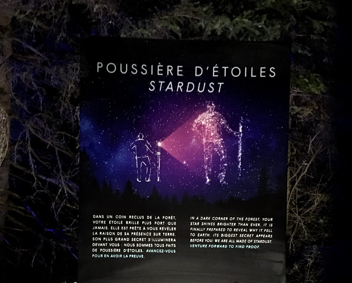 Nova Lumina plaira à tous, que vous ayez 4 ou 94 ans… À l’aide de votre bâton lumineux, vous suivrez un trajet animé, tout en musique et en féérie, en compagnie d’une étoile que vous aurez recueillie. Pour en profiter pleinement, il faut prendre son temps, lire et savourer chacun des tableaux. Malgré l’heure tardive et la noirceur, notre petite fille d’un an est restée éveillée durant tout le parcours, les yeux grand ouverts et fascinés. Nous aurions pu apporter notre chariot, mais l’idéal est vraiment de transporter les tout-petits dans un sac à dos ou un porte-bébé. Pour les plus jeunes comme notre garçon de 5 ans, ils reçoivent un bâton de marche à leur taille, ce qui rend l’expérience absolument géniale. Si, ce soir-là, le temps est dégagé, vous aurez même la chance de saluer votre étoile lors de son retour dans le ciel: on vous promet qu’après cette soirée unique, toute la famille fera de beaux rêves!