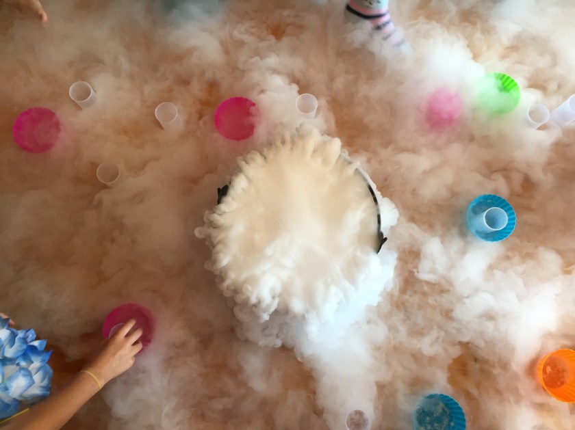 L’autre activité choisie était la potion magique, ou, si vous préférez, des expériences avec de la glace sèche. Les dix filles présentes ont adoré manipuler la glace et voir les différentes réactions. C’était franchement impressionnant de voir les bouchons sauter un peu partout, les pinces « crier » au contact de la glace et la fumée sortir de partout. Si ces deux ateliers ne plaisent pas trop à vos enfants (ce qui serait quand même surprenant), ils pourront alors opter pour les bulles géantes, la fabrication de glue (ma fille a longtemps hésité avec celui-ci) ou d’autres activités qui nous semblaient toutes intéressantes.