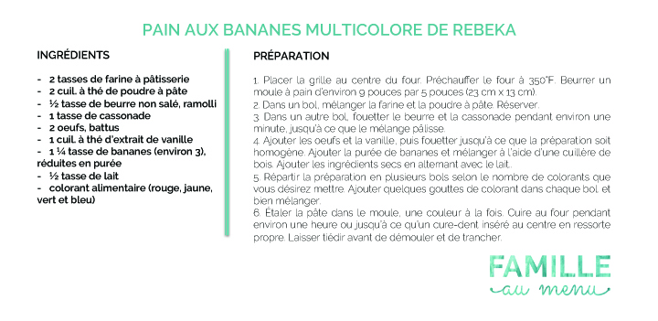 Avez-vous essayé de réaliser le pain aux bananes multicolore de Rebeka? On veut voir le résultat! N’hésitez pas à partager avec nous vos créations sur les réseaux sociaux en utilisant le mot-clé #familleaumenu!
