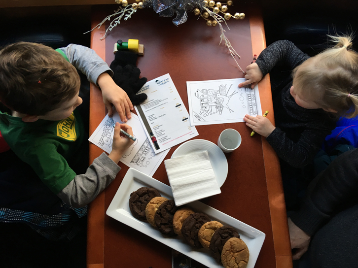 À notre arrivée, avant même d’entrer dans le train, fiston se fait taquiner par un lutin coquin! À bord, une assiette de bons biscuits double chocolat et chocolat blanc nous attend, ainsi que des coloriages et quelques crayons: un bon moyen de patienter jusqu’au grand départ!