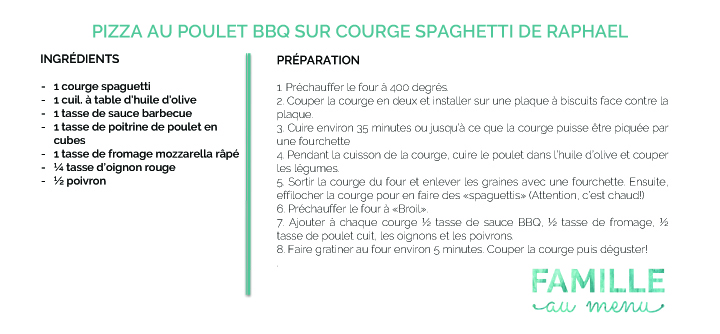 Pour obtenir la recette de la pizza au poulet barbecue dans une courge de Raphael, cliquez sur l’image ci-bas, pour pouvoir ensuite l’imprimer! Bon appétit!