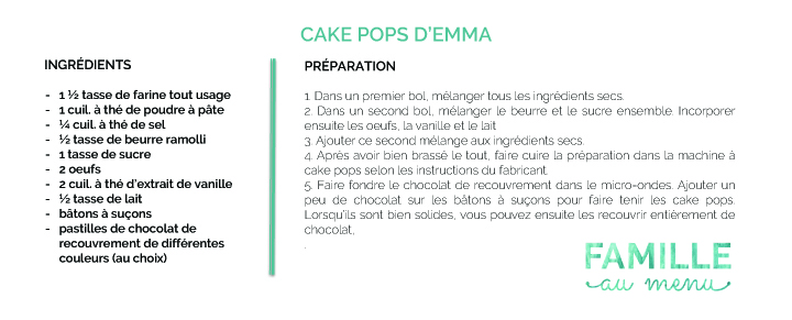 Pour obtenir la recette des cake pops d’Emma, cliquez sur l’image ci-bas, pour pouvoir ensuite l’imprimer! Bon appétit!