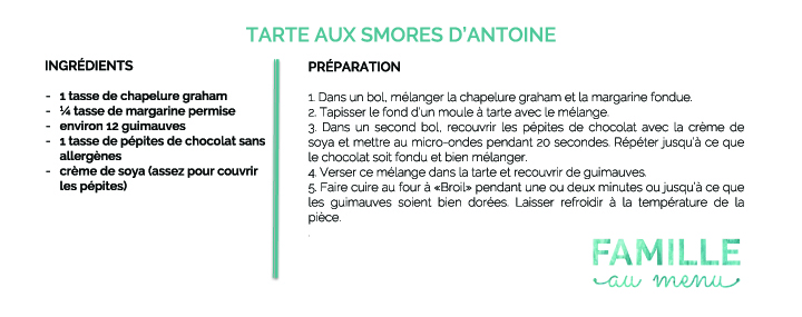 Pour obtenir la recette de la tarte aux smores d’Antoine, cliquez sur l’image ci-bas, pour pouvoir ensuite l’imprimer! Bon appétit!