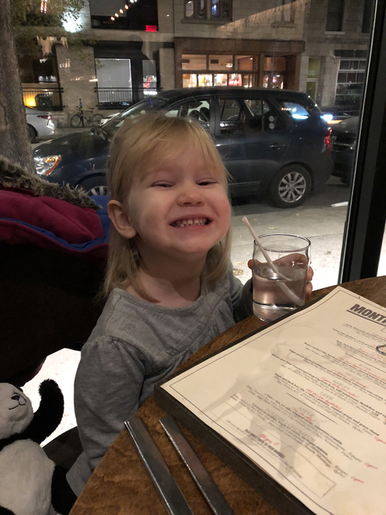 Une petite fille très heureuse d’être au restaurant un soir de semaine!