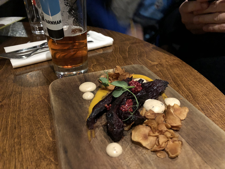 Le menu du chef Guillaume Paimparay était fort intéressant, nous faisant à la fois découvrir de nouvelles saveurs en même temps que des produits d’ici. J’ai particulièrement apprécié mon entrée d’esturgeon en gravlax aux herbes salées du Bas du Fleuve. Mention spéciale aussi pour un petit détail: le beurre porto et canneberges qui accompagnait le pain pour nous faire patienter était vraiment superbe.