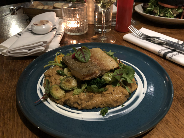 Truite laquée à l’érable , purée de chou-fleur et oignons rôtis, crème sure au cresson de rivière et légumes du marché