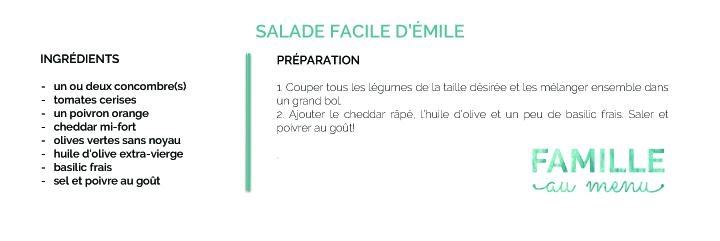 Avez-vous essayé de réaliser la salade d’Émile? On veut voir le résultat! N’hésitez pas à partager avec nous vos créations sur les réseaux sociaux en utilisant le mot-clé #familleaumenu!