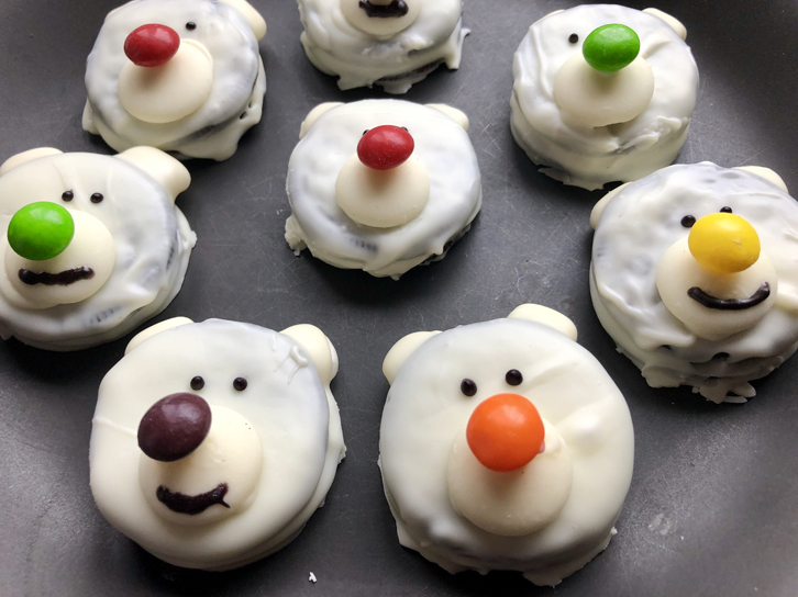 Sur les biscuits de votre choix, vous n’avez qu’à y déposer du glaçage blanc. Avant que ce dernier ne fige, ajoutez une grosse guimauve (pour la tête) et des Skittles (pour les boutons). Il vous restera à dessiner la tête du bonhomme avec des crayons alimentaires ou du glaçage et à dessiner les bras! Effet wow garanti!