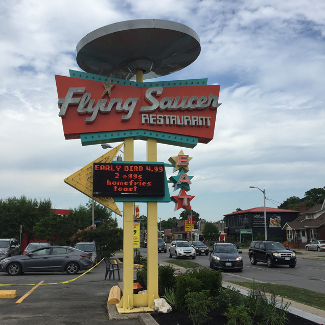 Comme nous restions en camping, nous n’avons pas mangé souvent au restaurant lors de notre séjour à Niagara Falls. Cependant, un restaurant classique du coin, sur Lundy’s Lane, a rapidement attiré notre attention: le Flying Saucer Restaurant!