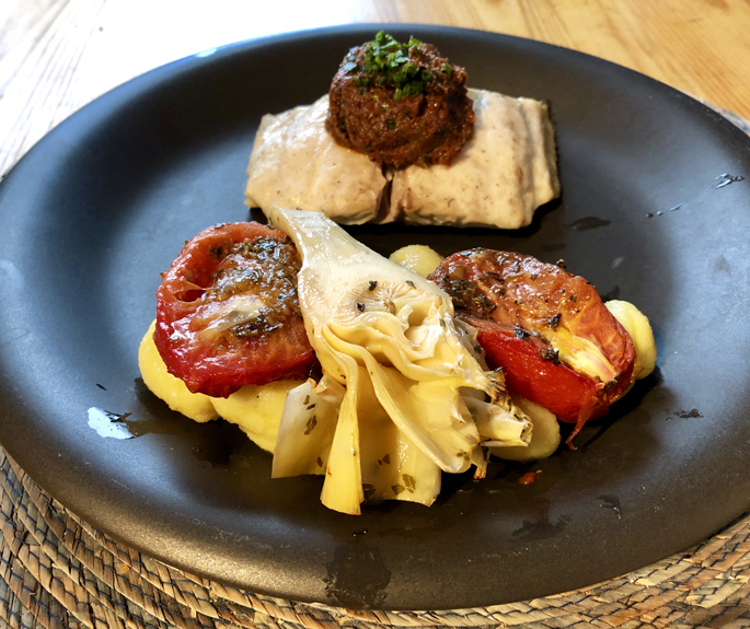 Notre coup de coeur, à mon conjoint et moi, est cependant le bar sauvage, tapenade d’olives kalamata, gnocchis, artichauts et tomates italiennes confites. Le tout fondait en bouche et c’était très copieux! Du côté de ma fille, c’est la quiche qui a remporté les honneurs. C’est parfait, car il y en a une différente à chaque semaine!