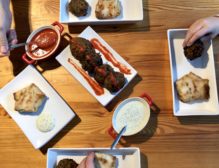 En famille, on a adoré leurs petites bouchées végétariennes ou à la viande. Les croquettes de patates douces et haricots noirs, sauce tandoori aux amandes, ont été un succès avec nos pastillas d’agneau, sauce à la menthe, qui nous ont rappelé le Maroc. Et manger avec les mains, c’est toujours gagnant!