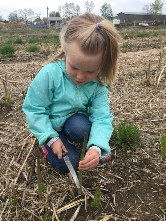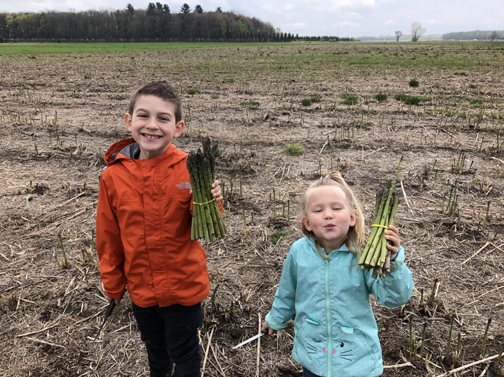 La cueillette d’asperges est vraiment différente pour les enfants: les nôtres adorent! En expliquant aux plus jeunes comment utiliser le couteau de façon sécuritaire (en tenant le haut de l’asperge), ils réussissent eux-mêmes à faire tout le travail. On a beaucoup de plaisir!