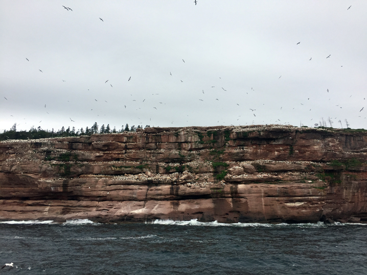 Premier aperçu de la colonie de Fous de Bassan, lorsque l’on fait le tour de l’Île Bonaventure en bateau. On a aussi souvent la chance d’y observer des phoques gris qui se reposent sur les roches avoisinantes.