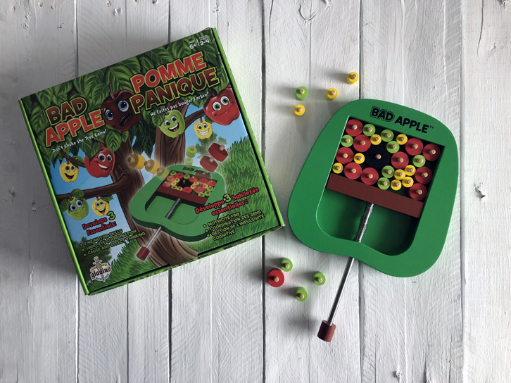 Le mois dernier, nous avons découvert ce jeu dont les règles sont toutes simples, mais qui a beaucoup de succès chez nous! Dans un arbre en bois, il faut tenter de retirer les pommes, tour à tour, sans faire bouger la barre. Le jeu indique qu’il s’adresse aux jeunes de 6 ans et plus, mais ma fille de 3 ans l’adore. En plus, notre garçon pratique ses mathématiques en calculant les points de tout le monde à la fin de la partie. Une autre belle nouveauté des Éditions Gladius!