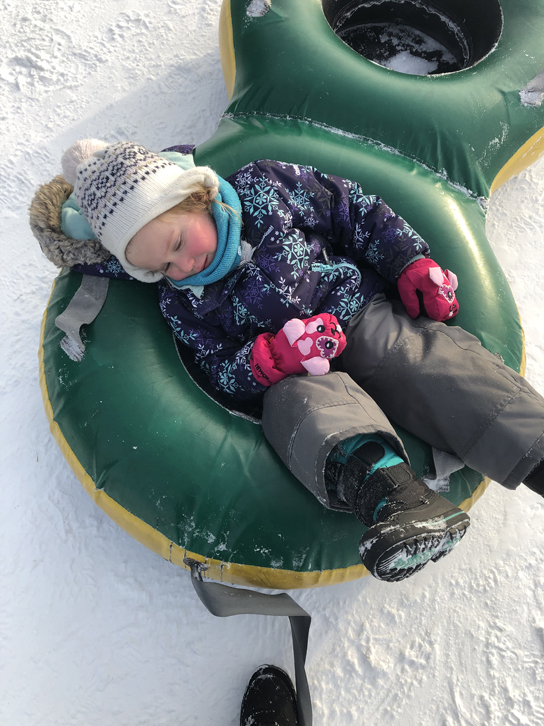 Une petite fille épuisée d’avoir passé toute la journée à glisser… jusqu’à la fermeture!