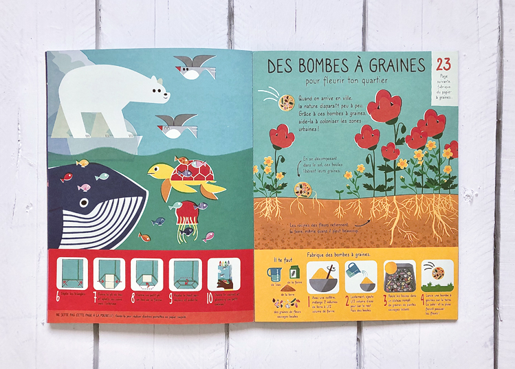 À chaque page, vos jeunes d’environ 7 ans et plus seront invités à réfléchir à une situation écologique et à réaliser un projet ou un bricolage: on aime tout particulièrement les nombreuses idées reliées au jardinage! C’est un très joli cahier tout en couleurs: on a hâte de l’utiliser et de le découper de toutes parts!