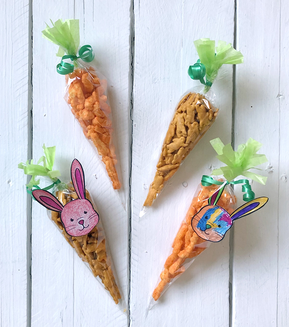 Une autre idée simple à offrir aux amis de la garderie! Pour les réaliser, il vous faudra seulement quelques emballages de plastique pour faire des cônes de bonbons (qui se trouvent aisément en ligne ou dans un magasin spécialisé en pâtisserie) ainsi qu’un peu de papier de soie vert et de ruban. Rapide et mignon! Vous pourriez aussi y joindre des petits dessins de lapins – vous trouverez ceux-ci sur la page Coloriages de Marie-Anne 😉 – ou encore une petite surprise.
