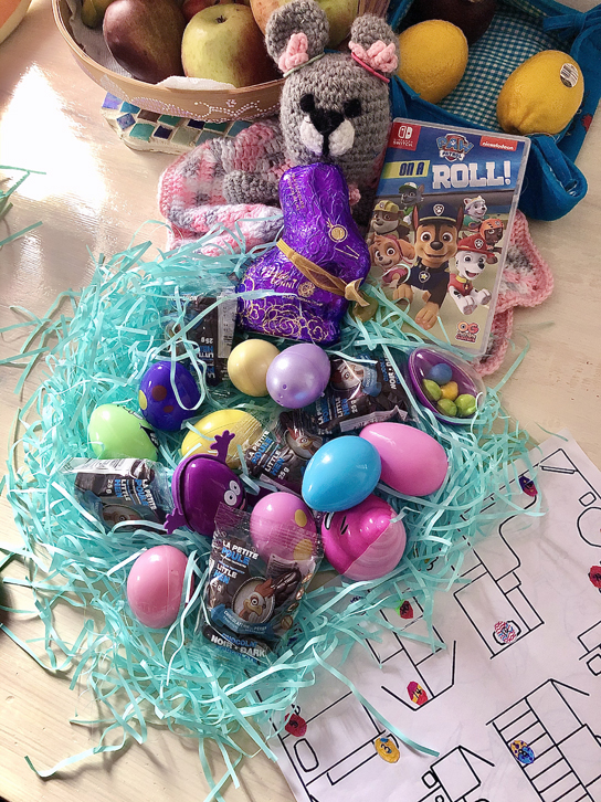On ne se complique jamais trop la vie avec la chasse aux cocos… Les enfants se font des nids avec de la paille et un toutou sur la table de la cuisine: ils y rapportent ce qu’ils trouvent tout au long de l’activité. On rempli les cocos de leurs chocolats préférés et on ajoute un petit cadeau plus spécial à la toute fin 😉 L’important, c’est de s’amuser!