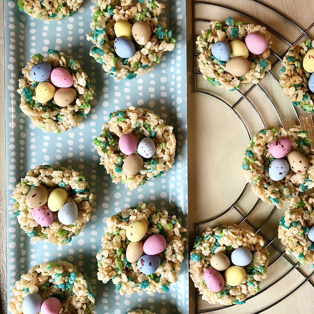 Ah! Les carrés de Rice Krispies… Un dessert peu compliqué à faire avec seulement trois ou quatre ingrédients: les traditionnelles céréales de riz soufflé, les guimauves, un peu de margarine ou de beurre et de la vanille (au goût). L’an dernier, je suis tombée sur cette idée par hasard: on écrase tout simplement le mélange dans des moules à muffins et on garnit les nids de petits cocos en chocolat. Une collation ou un dessert joli et vite fait!
