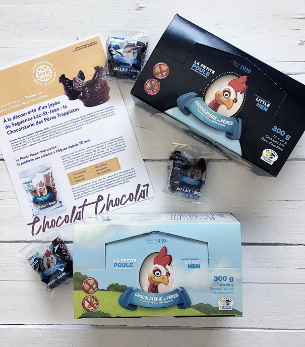 Cette année, nous avons été gâtés avec quelques boîtes des petites poules de la Chocolaterie des Pères Trappistes (vous savez, les mêmes qui font les fameux bleuets dans le chocolat), mais comme en témoignent ces photos de l’année dernière, nous avions déjà l’habitude de nous en procurer, chaque année, pour la chasse aux cocos. On craque tout simplement pour les petites poulettes au chocolat noir!