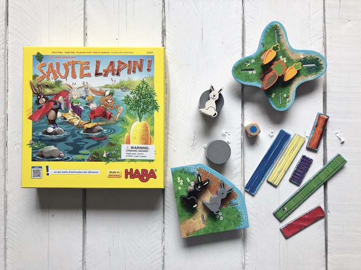 Nous avons reçu le jeu Saute Lapin il y a déjà deux ans et c’est l’un des jeux que notre fille de 5 ans préfère. Le jeu illustre une course de lapins sur l’eau: on doit être le premier à aller récupérer la carotte d’or tout au bout du parcours.