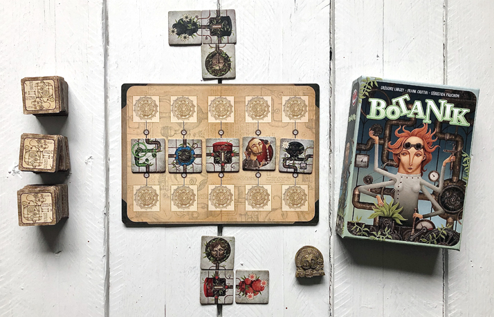 Botanik est un superbe jeu de tuiles, qui se joue en duel et qui s’adresse aux jeunes de 10 ans et plus. L’objectif est d’être celui qui aura accumulé le plus de points de victoire en construisant sa machine. Les tuiles, qui peuvent être de même type ou de même couleur, doivent être placées en jeu et libérées selon des règles précises d’association ou de dissociation.