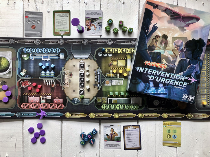 Dans Pandemic Intervention d’urgence, le plateau représente un avion spécialement équipé pour préparer des ravitaillements durant le temps de vol. Chaque joueur a un rôle qui lui donne un avantage précis, mais nous devons tous travailler en collaboration dans le but d’aller livrer rapidement les bonnes ressources à chacune des villes sinistrées.