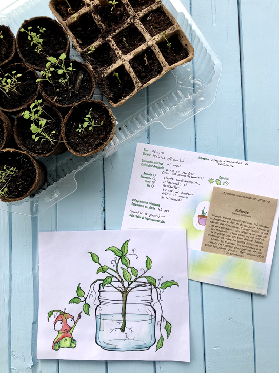 Pour pouvoir suivre la progression de nos semis et de nos récoltes, nous avons commencé à faire un carnet de jardinage! Nous nous sommes procurés des étampes Chaque jour compte spécialement pour le projet, mais c’est quelque chose qui pourrait être personnalisé comme bon vous semble, avec ou sans les enfants. L’idée de base est d’y noter la provenance de tout ce que l’on trouve dans notre jardin et de pouvoir y suivre l’évolution et l’entretien de chacun des plants. De notre côté, nous allons aussi y ranger nos sachets de semis!